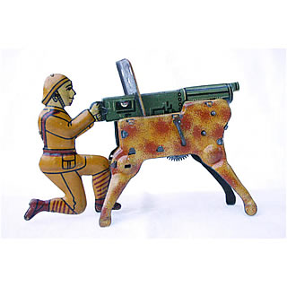 Soldado con una ametralladora del fabricante Rogelio Sanchís, juguete de los años 30 hecho de hojalata litografiada